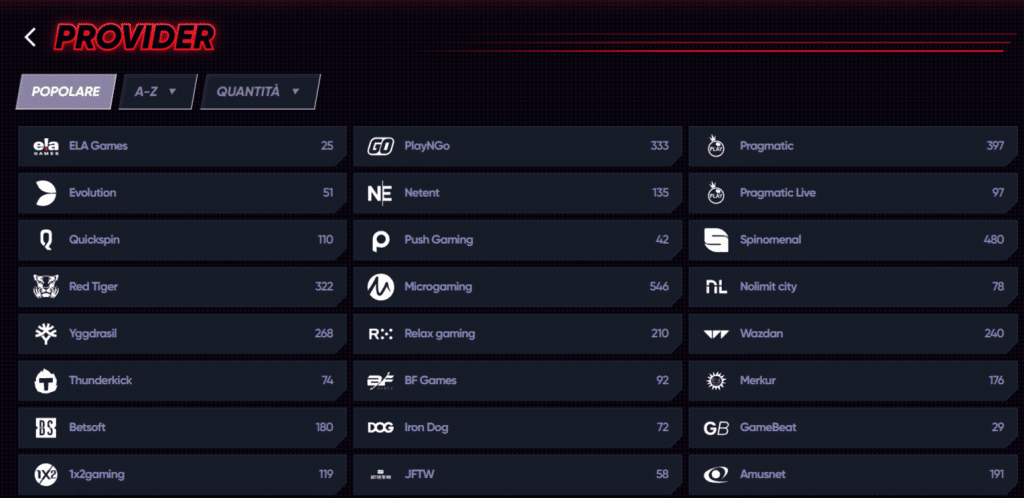 Ovviamente, questa è solo una breve lista dei provider più popolari presenti su questa piattaforma di gioco d’azzardo online; qualora voleste visionare l’intera lista, vi basterà accedere ad una delle sezioni di gioco e cliccare su “Provider”. In questo modo, potrete scegliere e filtrare i risultati in base ai vostri provider di giochi preferiti.